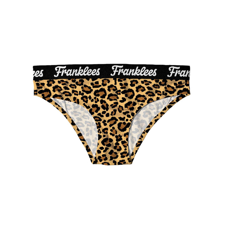 A flattering fit, oh yes indeed! The Bikini Brief is a curve loving cut - soft, sweet and ever so classic. But Franklees is here to shake it up like a Leopard would! Comfortable and quality Cotton blend mid rise bikini brief underwear featuring our signature logo trim. The bikini brief is a best selling basic Women's underwear style and Leopard Print a classic. Casual and confident! Franklees bikini brief matches perfectly with our range of women’s Leopard Print crop top bralettes, open back bralettes and triangle bralettes.